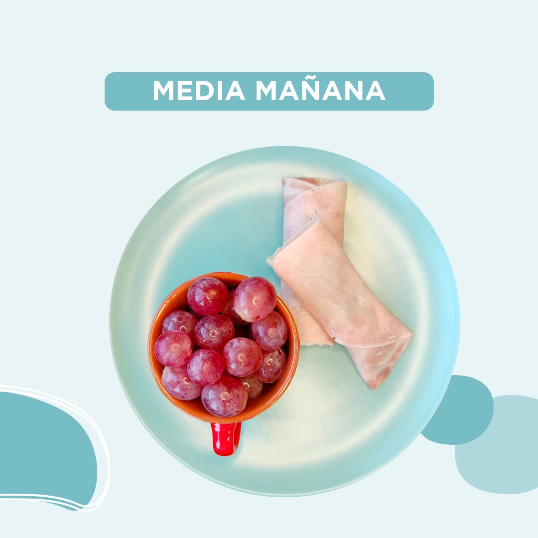 - MEDIA MAÑANA O POST ENTRENO: Uvas + 2 rollitos de jamón cocido con queso fresco, aguacate, sal y pimienta negra